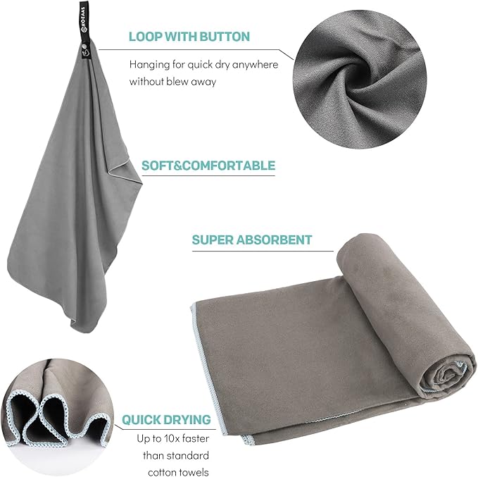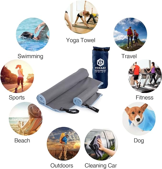 • SUPER ABSORBENT & QUICK DRYING: HOEAAS microfiber camping towel is made of soft and skin-friendly microfiber fabrics, which super absorbent and fast drying. Soaks up 5X its weight in water and dries nearly 10X faster than cotton towel, repeat use it a short time, no bad odors. So you never have to worry about your microfiber beach towels soiling or stinking up the rest of your gear. After dry your sweat or body water, Spread out or hang up the quick dry towel will be dry in minutes!