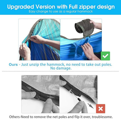 • Convert to a normal tree hammock: Just unzip the zipper, no need to take out pole, no damage, put the mosquito net into the inner pocket, then you get a regular tree hammock conveniently. 2 ways to use this Camping Hammock.