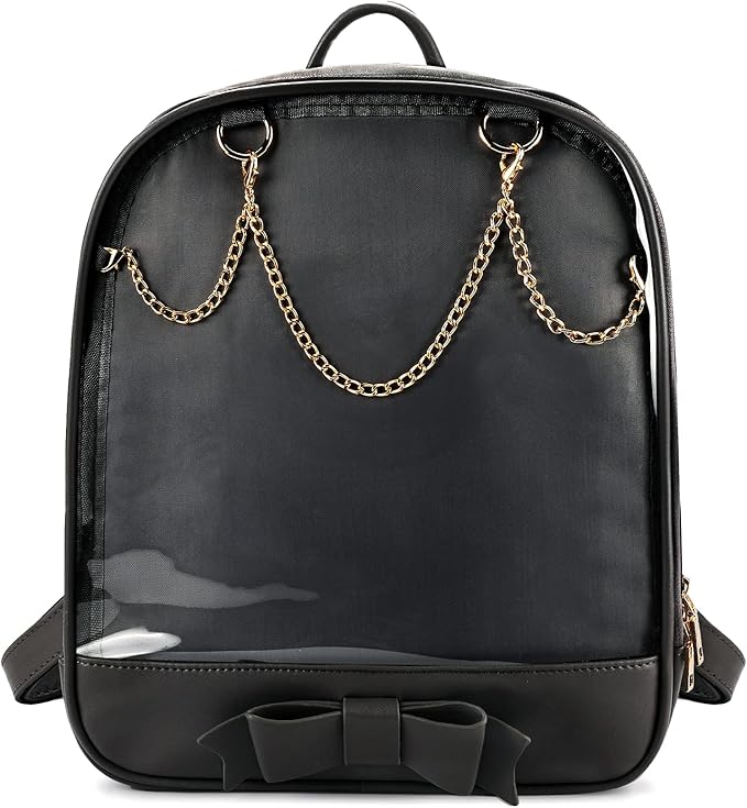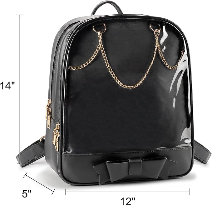 • ❤Structure❤:The ita backpack have a clear window.It also have metal chains and two hooks,you can hang anime keychains on it.One main large pocket for daily essential stuffs.Two inside open pocket for keys,cards,cashes,or coins.Shoulder straps can be adjustable.