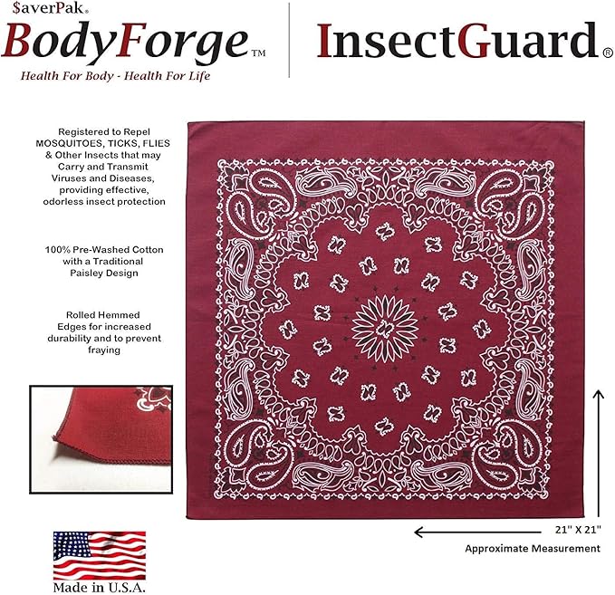 • InsectGuard BodyForge Bandannas are approximately 21”x21” in size. Great as - gifts for women, gifts for men, gifts for mom and stocking stuffers! 100% COTTON: Super breathable fabric with rolled hem sewn all around the edges makes the fabric ultra-durable.