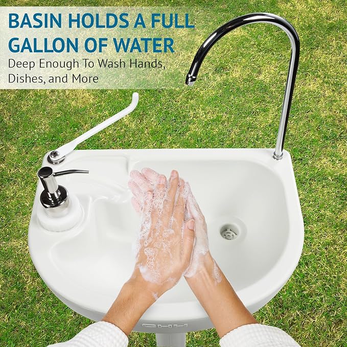 • PORTABLE OUTDOOR SINK - Multipurpose Cleaning Station Features Large Pedestal Sink & 19L Water Tank for Backyard Parties, Picnics, BBQs, Events, Camping, Worksite, Hiking, Hunting & other Recreational Activities