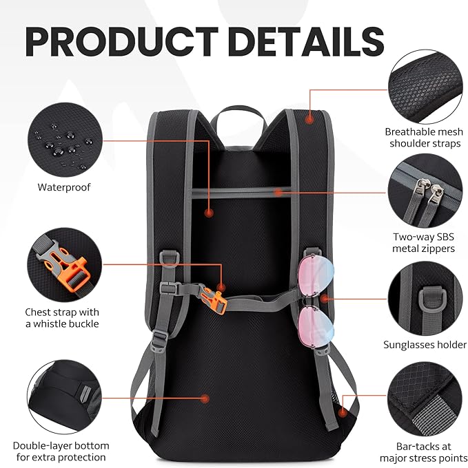 • Compact and Comfortable: It weighs only 1 pounds, can easily fold into its own pocket for storage,and unfold it when you need it. Perfect all-purpose carrying bag for traveling , easily fit in the luggage. Breathable mesh shoulder straps with plentiful sponge padding help relieve the stress from your shoulder. The chest clip with a whistle buckle work perfectly to distribute the pack’s weight and keep it steady and centered. A must have for sports , hiking and camping