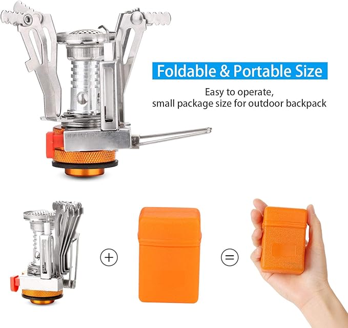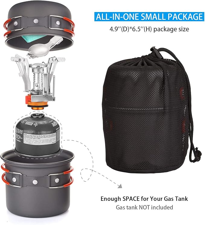 • Easy to Carry: Foldable handles on pot or stove can be folded to save space. Small size and portable, all the objects in this cooking set can be stored together in a mesh bag for convenient carry.