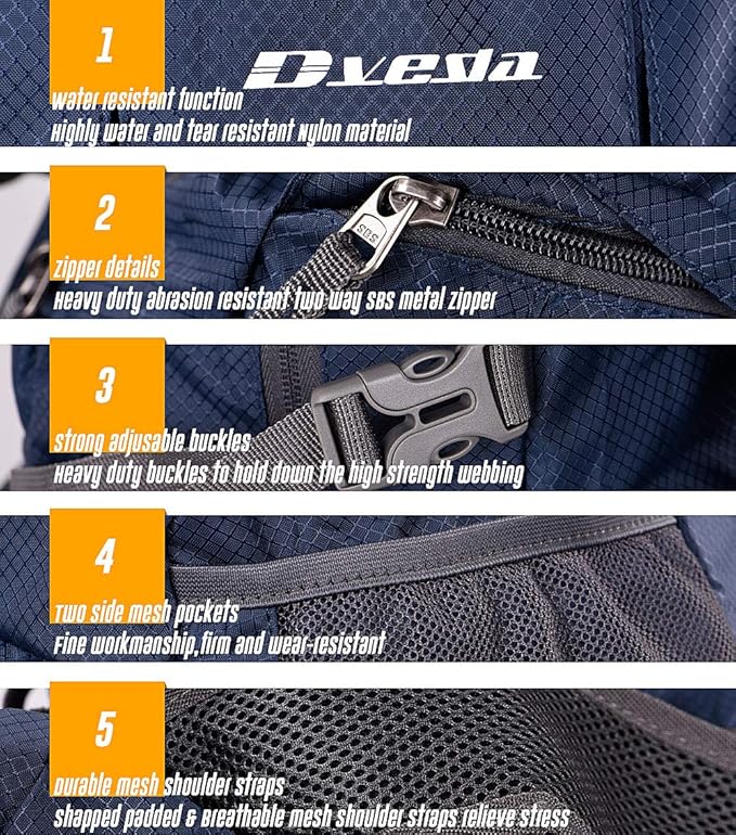 • 🚵★ Enjoying Your Hiking Backpack★ :Dveda 35L hiking backpack ideal for Disney day trip, day travel, overnight trip, camping, day hiking and vocation. Great hiking backpack for women and men. Its rip-resistant nylon construction sheds rain and resists wear better than cheaper polyester. Our Products have 12 moths Replacement Service and 100% Satisfaction, If you are not Satisfied with your Purchase for Any Reason, Please Feel Free To Contact Us.