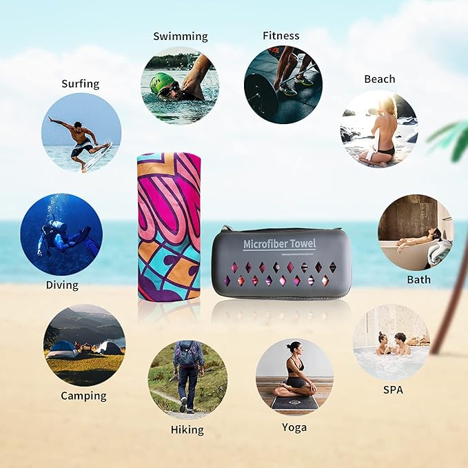 • ✔️【LIGHTWEIGHT AND SUPER SOFT】: No need to worry about your bag weighing too much when you travel with our microfiber beach towels, this beach towel only has about 0.66 LB. Soft as baby skin, it's perfect to use while traveling, exercising, swimming, bathing, camping, yoga, or simply dry up your face.
