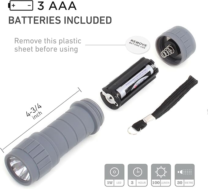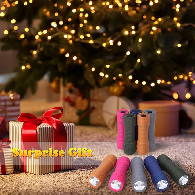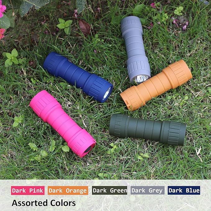 • COLOR ASSORTED AND BATTERIES INCLUDED: You will receive 6 colors assorted (Dark Silvery, Dark Green, Dark Blue, Dark Orange, Dark Pink, Dark Yellow). 3-pieces batteries are included and pre-installed inside each flashlight. Please take off the insulated sheet before use.