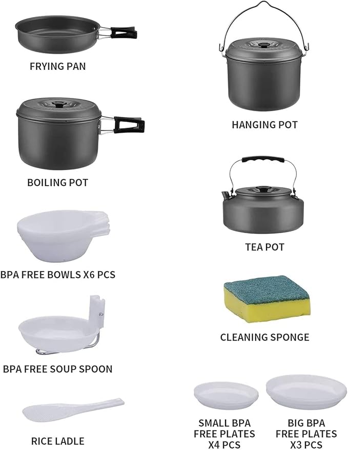 • Complete 5-7 Person Camp Cookware——The 24 pieces family camping cooking set includes 1 hanging pot,1 boiling pot,1 frying pan, 1 kettle,6 BPA -free bowls,4 BPA Free small plates,3 BPA Free big plates,1 BPA Free foldable soup spoon, 1 rice ladle, and 1 cleaning sponge. You can enjoy delicious food with your family anywhere.Best money ever spent.