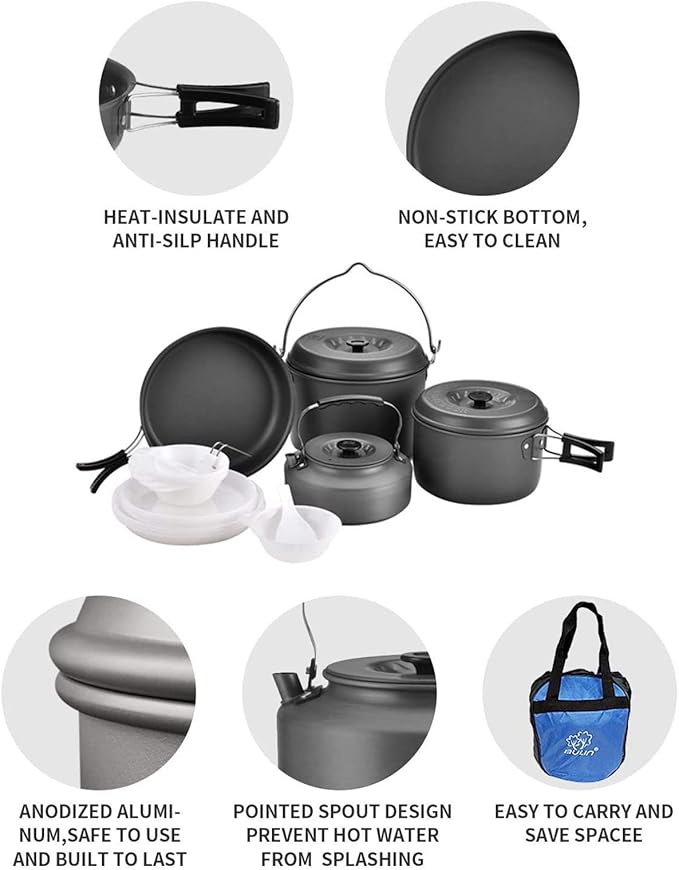 • Food-grade Material--The camping mess kit is made of safe, non-toxic aluminum with non-stick coating for easy cleaning. Hard-anodized aluminum conducts heat quickly,stand high temperature, corrosion-resistant, rust-free,built to last. Heat-resistant handles to keep your fingers safe from the heat.Secure and anti-scald.