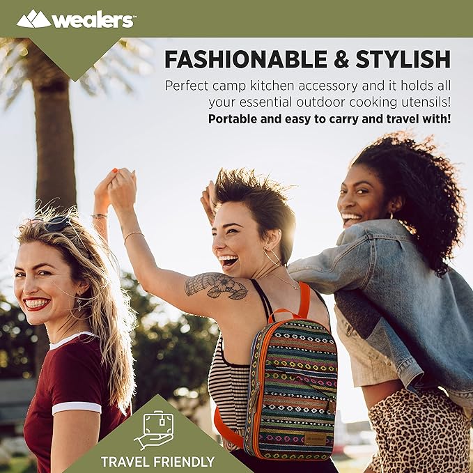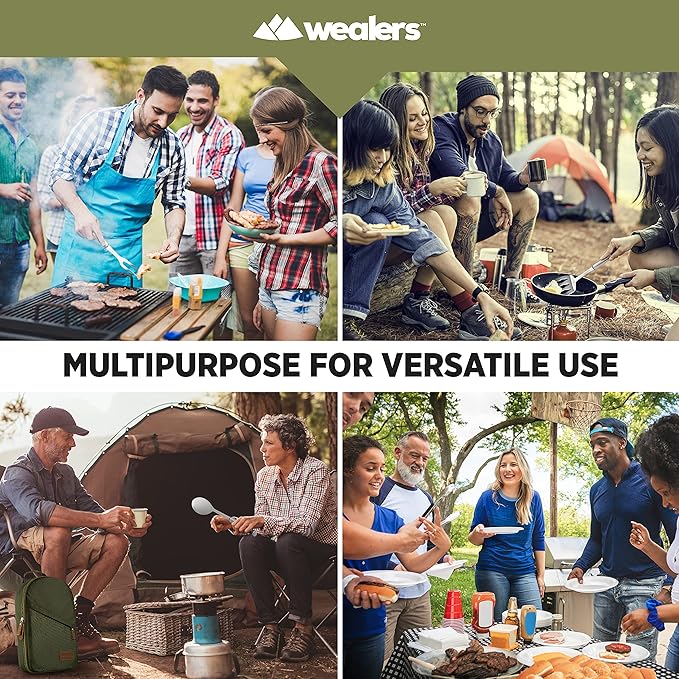 • MULTIPURPOSE: The trendy kit can be used for multiple applications, perfect for concerts, sporting events, hiking, boat rides, mountaineering and BBQ’s. The weather retardant the travel utensil kit is the perfect camp kitchen accessory, and it holds all your essential outdoor cooking utensils.