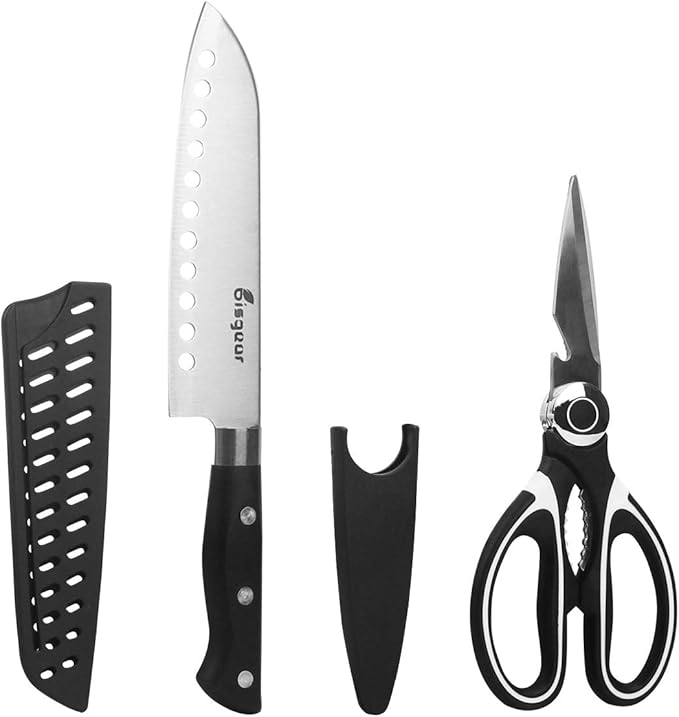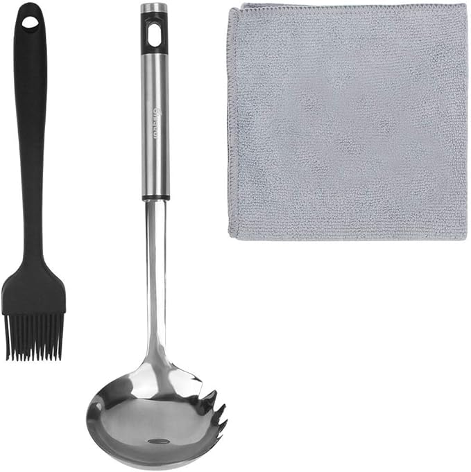 • NEW VISION COMPACT ORGANIZER: Neatly organizes and holds your utensils in one convenient place. Each utensil has its own designated pouch, so units don’t get smeared, scratched or damaged in storage or in transit. This 17PCs set includes: Serving Fork,Scissors with Sheath, Utility Knife with Sheath, Cutting Board, Spatula, Can Opener, Soup Ladle with Fork, Tongs with Silicon , Steak Fork, Grater, 2pcs Plastic Spice Shakers, silicone oil brush and 7" spoon+spork+knife.