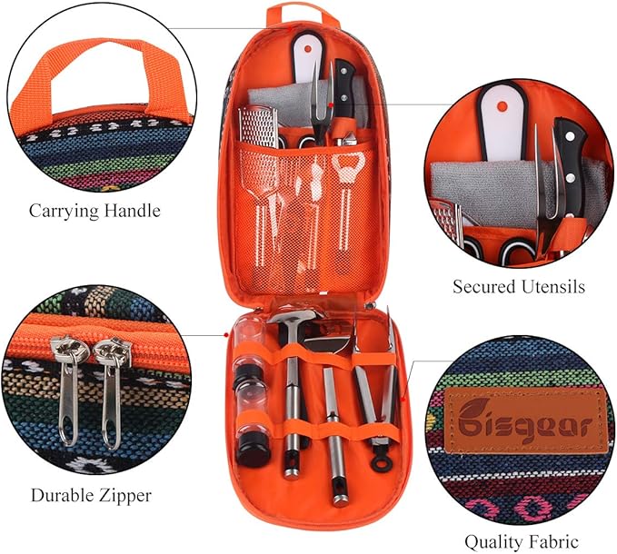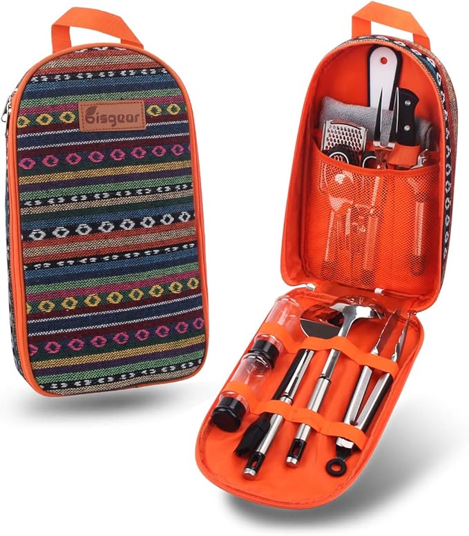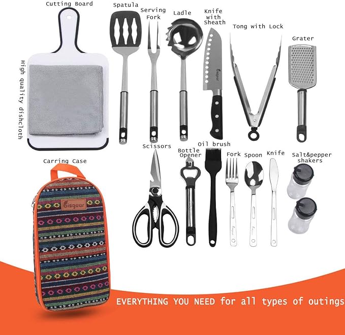 • MULTIPURPOSE: The trendy kit can be used for multiple applications, perfect for camping, sporting events, hiking, boat rides, mountaineering, BBQs, and more. The weather retardant travel utensil kit is the perfect camp kitchen accessory, and it holds all your essential outdoor cooking utensils.