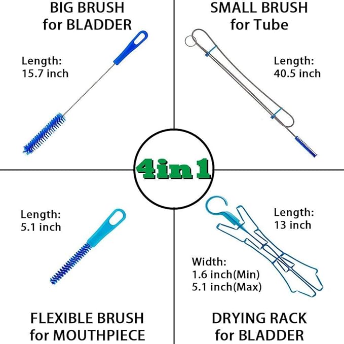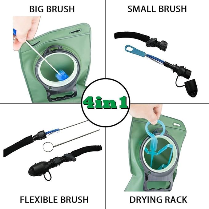 • 4pcs hydration cleaning kit includes 1 x FLEXIBLE tube brush, 1 x BIGGER bladder brush 1 x SMALLER bite valve brush and 1 x COLLAPSIBLE drying hanger rack.