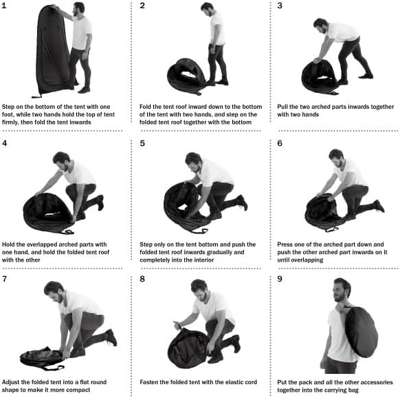• POP UP INSTALLATION - This tent automatically pops open in seconds with no assembly required. The dual-sided zippered door of this portable shower tent can be shut for privacy or rolled and held open with the attached loop and toggles.