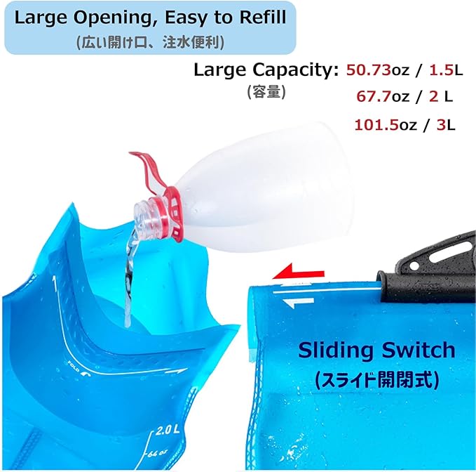 • 🏃‍♀️ LARGE OPENING & EASY CLEANING: Our hydration bladder has a large top opening for easy to fill the water, and easy to clean. The excellent inner wall provides a healthy and fresh drinking experience