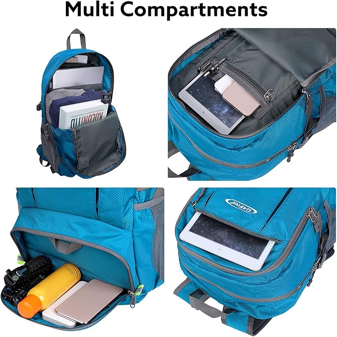 • 【Multi-Compartment Design】 This foldable backpack has 40L storage space. Featuring one main zipped compartment, a second large zipped front pocket, one front zipped hidden pouch, one front zipper compartment, and 2 side pockets. One separator and one small zippered pocket in the main compartment to organize your travel essentials or daily items.