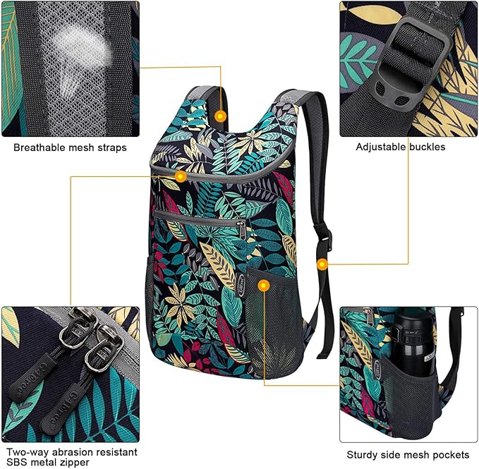 • Keep Things Organized: Foldable hiking backpack has two zippered compartments. The main pocket is large enough to carry travel essentials you need on the trip. The other pocket is great for quick access to items such as cash, credit cards, and passport. Two large sides mesh pockets for water bottles or umbrella