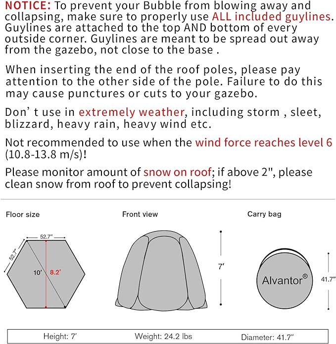 • SPACIOUS AND WARM: Alvantor big bubble gazebo provides a spacious interior shelter that comfortably fits between four and six adults. Enough room to place various pieces of furniture so you can give your bubble tent a homely feeling. The six, transparent PVC windows provide 360° view of your surroundings, whilst the inside of your bubble tent stays warm thanks to the excellent heat retention.