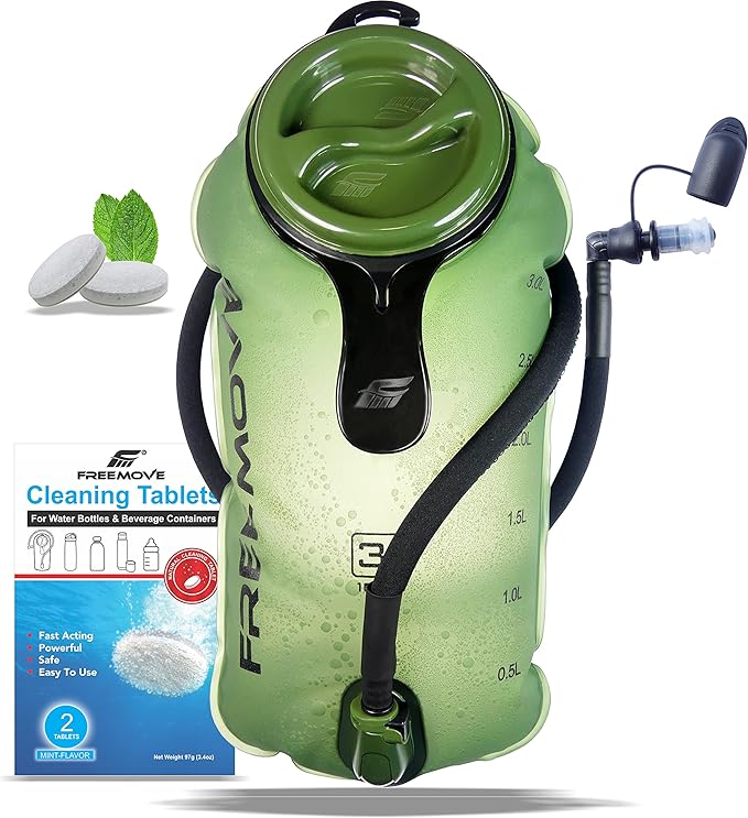 FREEMOVE Hydration Bladder 2L / 3L Water Bladder for Hiking Backpack >Blue or Green< Leak Proof Hydration Pack, Tasteless & BPA Free, TPU Water Reservoir, Quick Release Insulated Tube & Shutoff Valve