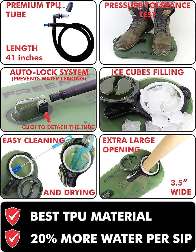 • The 3 Liter Hydro Bag Ads No Bad or Plastic Taste to the Water and the Large Fill Hole Makes It Very Easy to Clean, the Insulated Bladder Tube Will Prevent the Water From Overheating or Freezing While Hiking, It Has a Soft Bite Mouthpiece with Pull/Push Shut Valve to Prevent Leaking