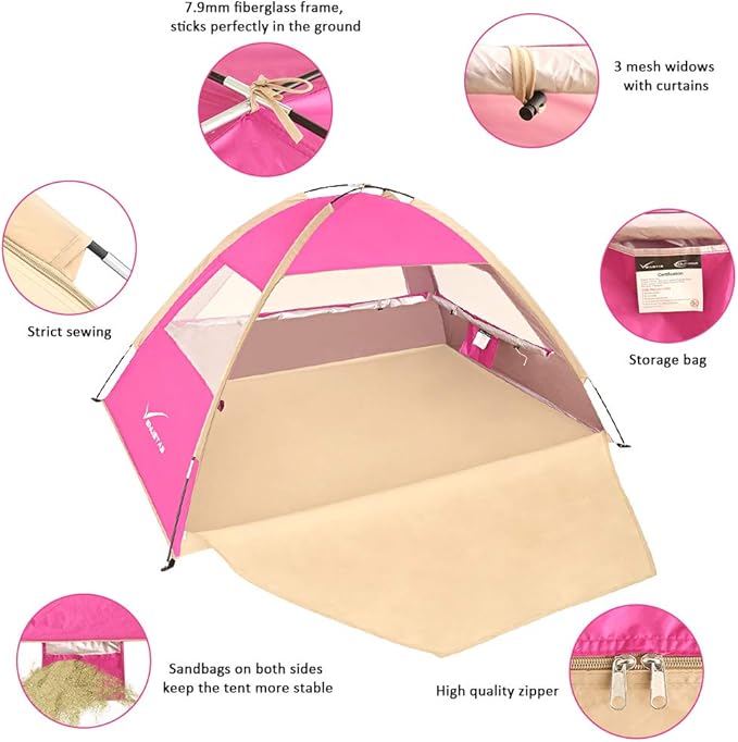 • Excellent Quality: Venustas beach sun shelter update the 8mm fiberglass frame is safer, more enduring, and rust-free (exactly the same standards as Decathlon use), which support the tent stably stand by itself, and keeps shape after a long time of use. Meet EU standard quality, with EU and US patents.