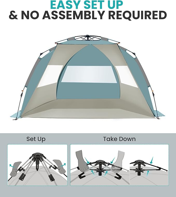 • Easy Set Up and Portable: This pop up beach tent allows to set up in seconds, without complicated installation steps. Frustrated days of putting up and taking down large beach tents has gone! Lightweight and easy to fold back with a compact carrying bag for easy transport and storage