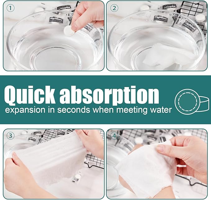 • WIDELY USED - Our towl tablets are suitable to wipe eyeglasses, dinning table, car, wound dressing, make-up removing and more. Hygienic and safe, perfect for multiple occasions like kitchen, hotel, salon, bathroom, office, hiking, camping, traveling, etc.