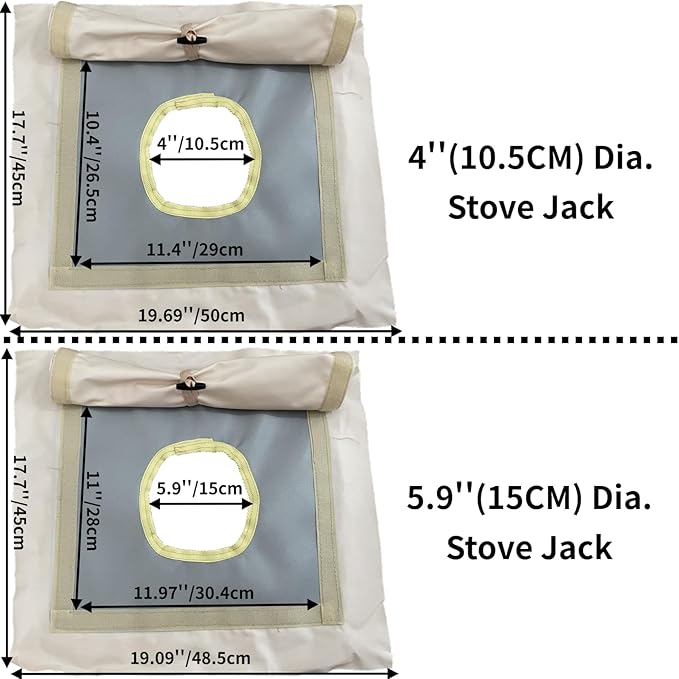 • SIZE OF STOVE JACK: Round hole Dia. :5.85’’. The size of stove jack is 19x19.5 inches.(Have the extra canvas around the outside to glue and sew in)Grey rectangle size:11x11.5 inch. Thickness: About four A4 papers