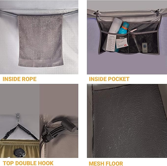 • SMART DESIGN WITH VENTILATION & STORAGE: Top and side mesh windows provide excellent airflow to keep things fresh. Dual ceiling hooks and side hooks support shower bags and heads, while inner mesh pockets, towel holders, and a clothesline keep everything organized. This Camping Shower Tent is built with your comfort in mind.