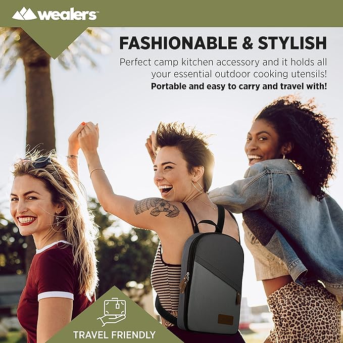 • MULTIPURPOSE: The trendy kit can be used for multiple applications, perfect for concerts, sporting events, hiking, boat rides, mountaineering and BBQ’s. The weather retardant the travel utensil kit is the perfect camp kitchen accessory, and it holds all your essential outdoor cooking utensils.