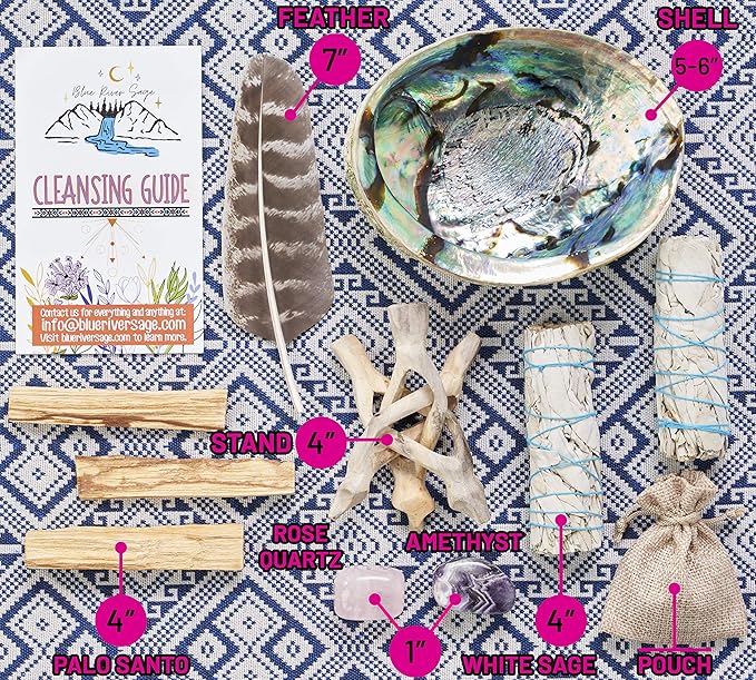 Home Cleansing & Smudging Kit with White Sage, Palo Santo, Abalone & Stand, Smudge Feather & Guide - Smudge Kit with Sage Smudge Sticks