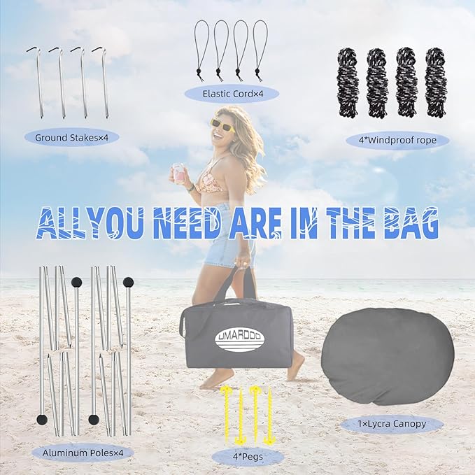 • PORTABLE WITH CONVENIENT TRAVEL BAG:Take UMARDOO sun shade beach tent with you wherever you go with our convenient travel bag. Our all-purpose pop-up sun tent comes packed with everything you need, including folding aluminum poles, tent pegs, and elastic cords.