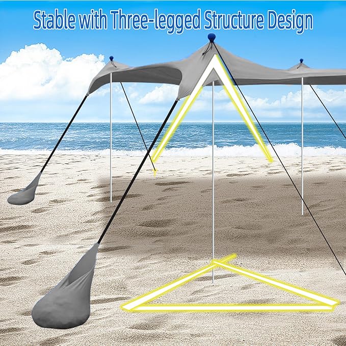 • STABILITY FEATURE:The beach shade canopy is supported by four aluminum poles (diameter 0.75 inch) and four large sandbags, along with 4 windproof ropes. They form a stable triangle that makes the tent highly wind-resistant.