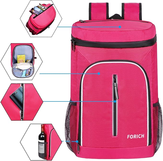 • ROOMY CAPACITY BACKPACK COOLER: 30 cans/30L, measures: 17" x 12" x 8". FORICH cooler backpack is large enough to organize all your necessities, such as drinks, beer, fruit, ice pack, meals, tall beverages, snacks, cellphone and so on. Also it can hold 2 bottles of wine on side pockets.