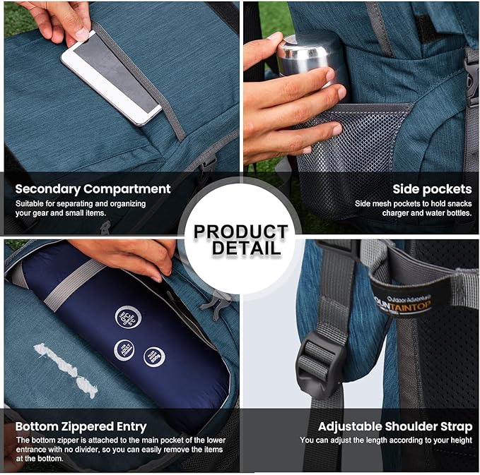 • Well-designed details: This outdoor backpack has many clever and convenient designs. The bottom compartment provides direct access to the main compartment; there is also a dedicated compartment for a water bladder (WATER BLADDER NOT INCLUDED), In addition, various shrink straps can also carry camping equipment such as trekking poles, sleeping bags and tents.