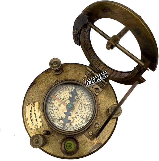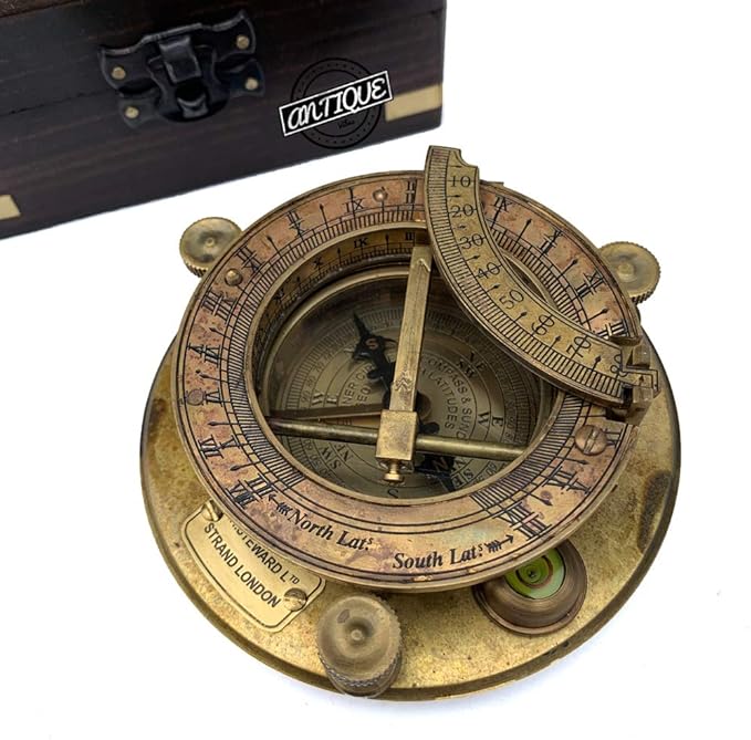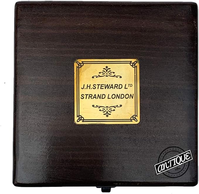 • Compass Size: 10 cm 4" inches Box Dimension: 12 x 12 x 6 cm Material: Brass & Wood Finish: Antique brass Weight: 500 grams with box Type: Magnetic Sundial Compass