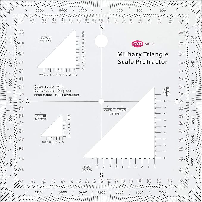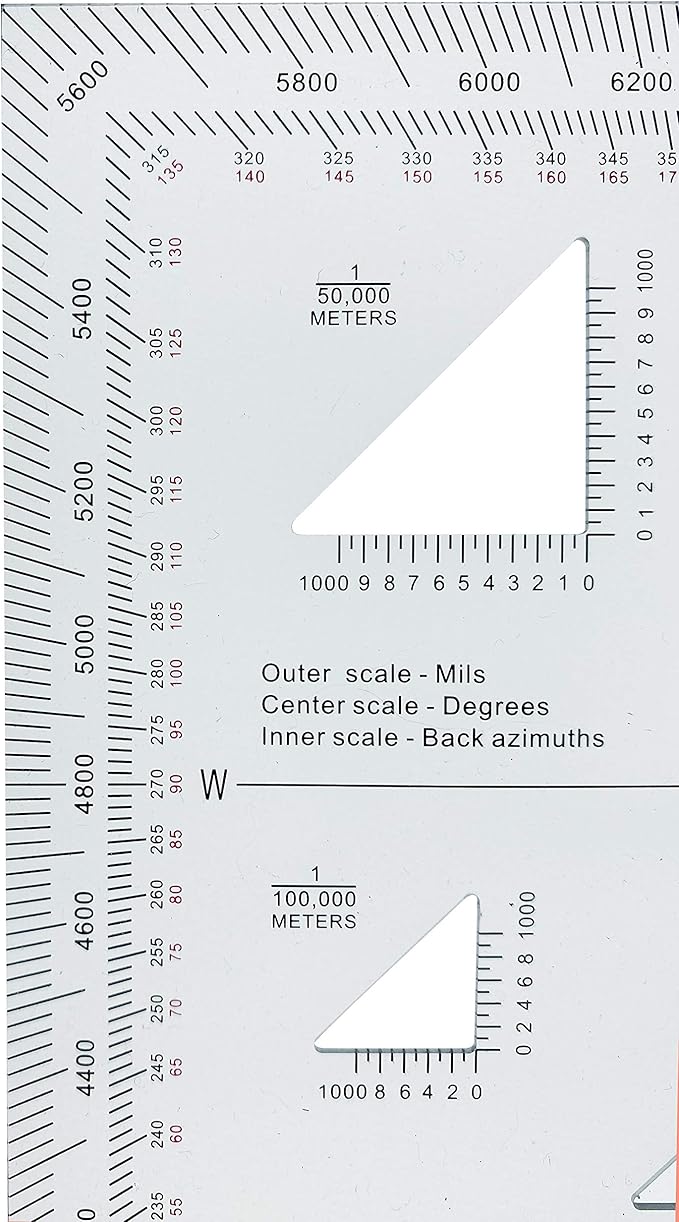 • The inner protractor is marked in degrees and the outer protractor is in mils.