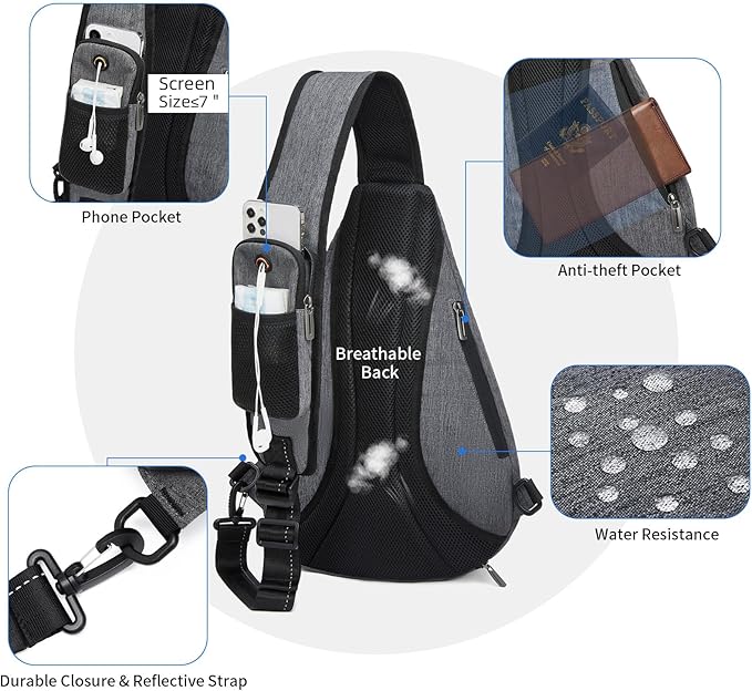 • ★ EARPHONE HOLE & USB CHARGING PORT - The sling bag crossbody men has a cell phone pocket with earphone hole on the strap. This is convenient for you to use the mobile phone and enjoy the music at anytime and anywhere. Please noted that this sling bag for men crossbody doesn't have power bank, usb charging port of this one strap backpack for men only offers an easy access to charge.