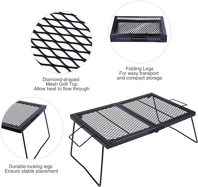 • Diamond-shaped Mesh Grill Top: The camping grill features a steel mesh grill top, which allows heat to flow through from a campfire below