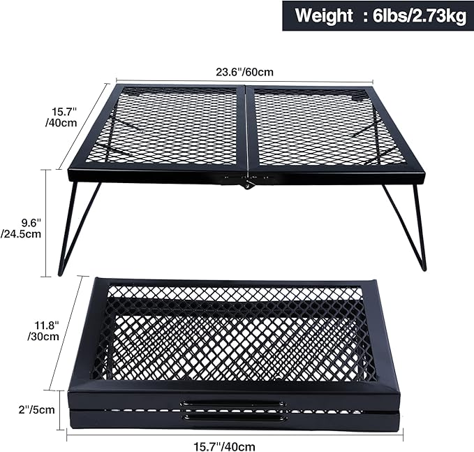 • Dimensions: This campfire grill is perfect fit on your campfire or fire pit to serve you delicious dishes. Opened size : 23.6*15.7*9.6"/60*40*24.5cm. Weight: 6.6lbs/3kg The Folding design make it easy to transport and storage. Fold size:11.8*15.7*2"/30*40*5cm