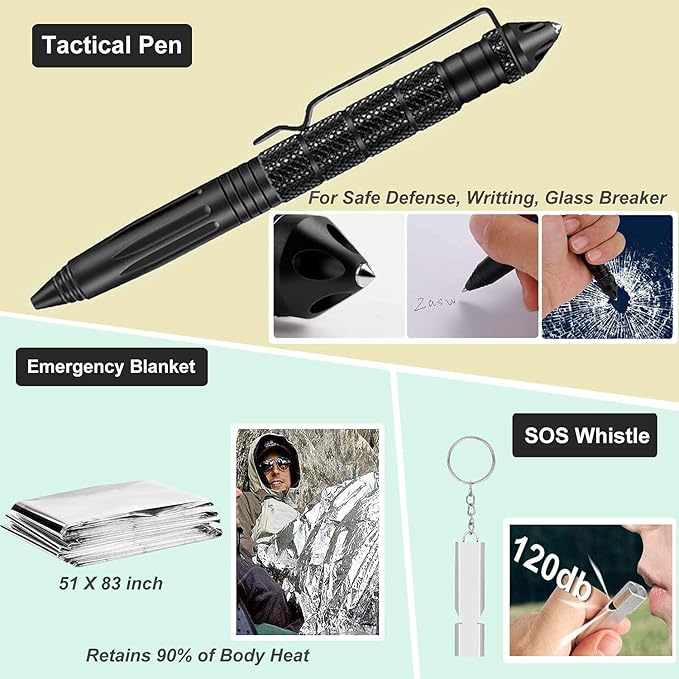 • Included Components : Whistle, Survival Bracelet, Flashlight, Emergency Blanket, Flint Stone Scraper, Parachute Cord, Tactical Pen, 18 in 1 Snowflake Tool, 14 in 1 Hatchet, Water Bottle Clip, Multi-use Spoon Fork, 2pcs Glow Sticks, Fishing accessories, 2pcs AA Battery, Storage Case Whistle, Survival Bracelet, Flashlight, Emergency Blanket, Flint Stone Scraper, Parachute Cord, Tactical Pen, 18 in 1 Snowflake Tool, 14 in 1 Hatchet, Water Bottle Clip, Multi… See more