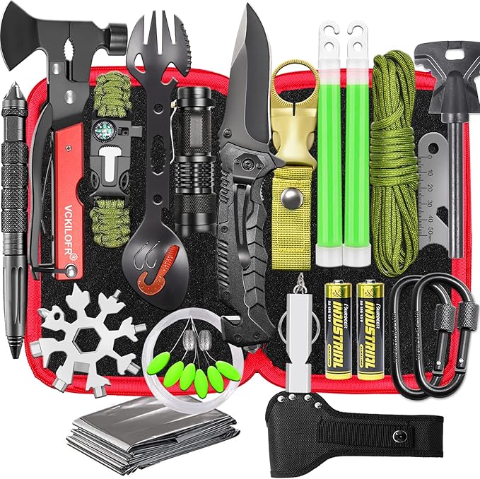 • Necessary Equipment You Must have: Contains 14 in 1 Hatchet, Tactical Pen, 18 in 1 Snowflake Tool, Water Bottle Clip, Emergency Blanket, Flint Stone Scraper, Flashlight, 2 pcs Glow Sticks, Multi-use Spoon Fork, Whistle, Parachute Cord, Survival Bracelet, Fishing accessories, 2pcs AA Battery, and Storage Case.