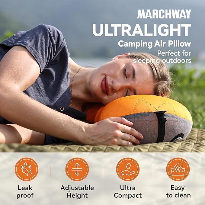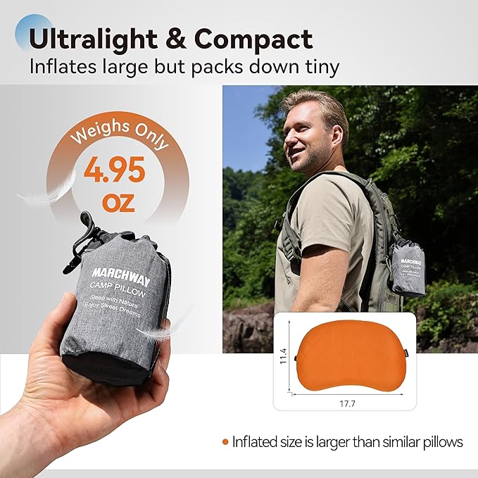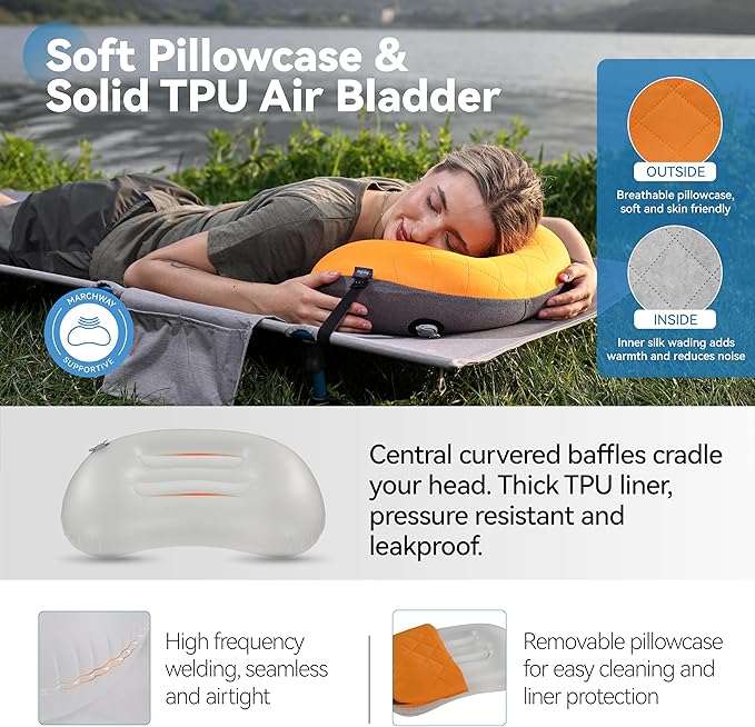 MARCHWAY Ultralight Inflatable Camping Pillow with Soft Washable Cover, Compact Compressible Portable Travel Air Pillow for Outdoor Camp, Sport, Hiking, Backpacking Sleep (Orange)