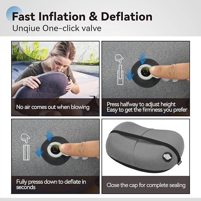 • Convenient Click Type One-Way Valve: Inlet valve has a spring loaded stopper that self seals as you inflate. Click the button to blow and air it up to the fullest in only 3-5 breaths, click again to quickly deflate in seconds. Slightly hold on the button to slowly release air to your desired firmness or softness, easy to adjust the comfort.