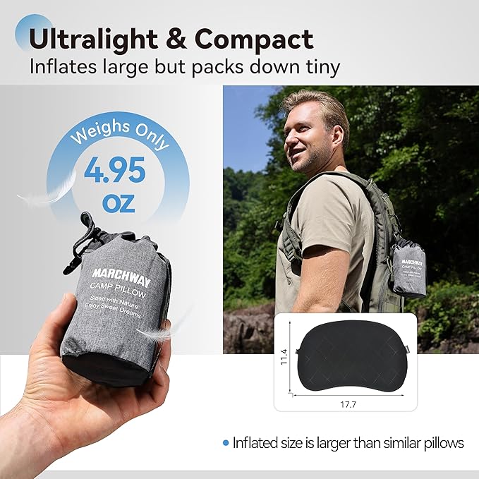 • Ultralight and Compact: This inflatable backpacking pillow weighs only 4.95 ounces. The size is adequately large to well support your head and neck when inflated, while packs down into included soda can sized storage bag when deflated, easy to put in your backpack or even in pocket, perfect for camper, hiker, backpacker and traveler.