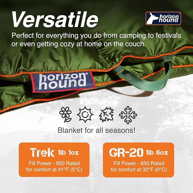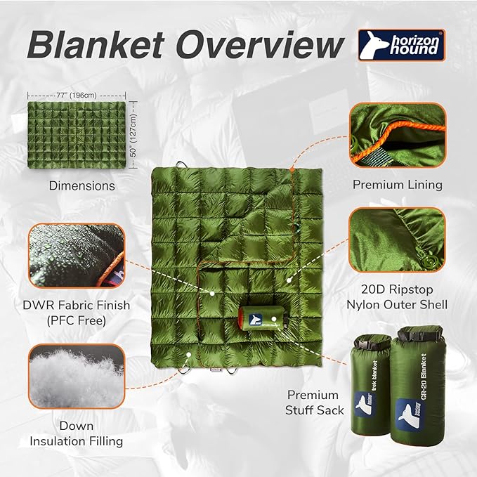 Horizon Hound Down Camping Blanket - Outdoor Travel Blanket | Sustainable Insulated Down | Lightweight & Warm Quilt for Camping, Stadium, Hiking & Festival | Water Resistant, Packable & Compact