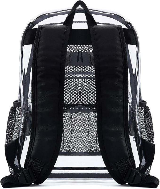 • Comfort padded straps: Our heavy duty clear backpack adopts reinforced strap stitches to fix the strap firmly. And, the adjustable shoulder straps of the clear plastic backpack are wider than usual to ease the stress and each strap is padded for comfort