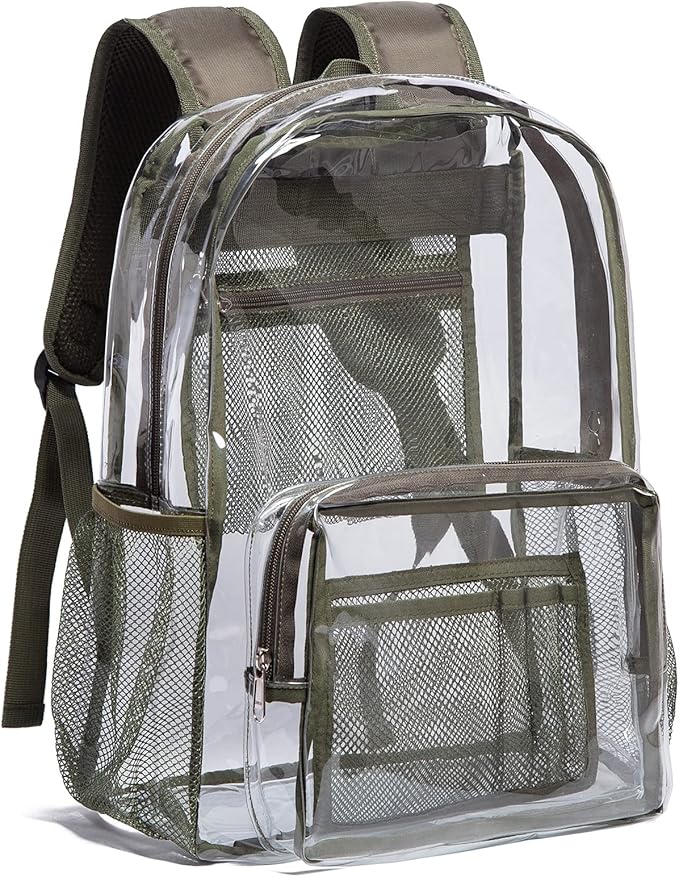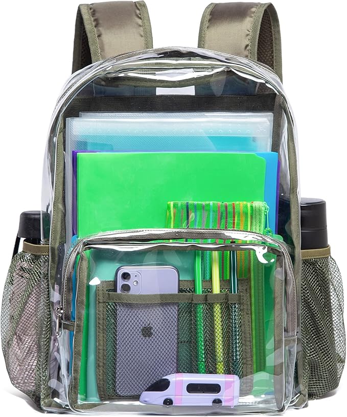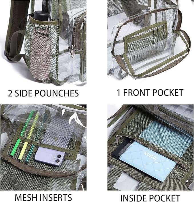 • Large clear backpack: Size: 15 x 12 x 7.5 inches, the clear back pack has 1 large main compartment for books, with a secure zipper pocket for small items, and 1 front compartment with 4 mesh slots for pencil cases, and pens. Besides, the clear bookbag has 2 side mesh pouches for water bottles or umbrellas
