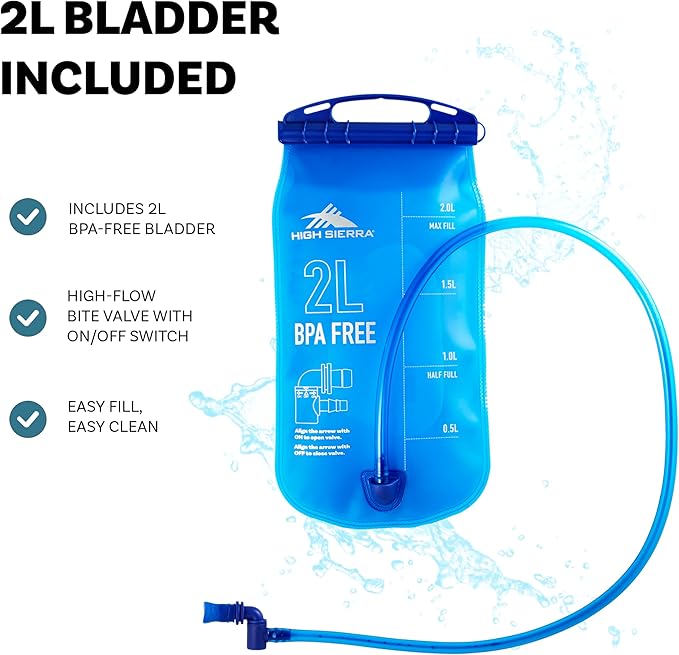 High Sierra Hydrahike 2.0 Hydration Backpack with 2L Water Bladder for Running, Hiking, Camping, or Cycling