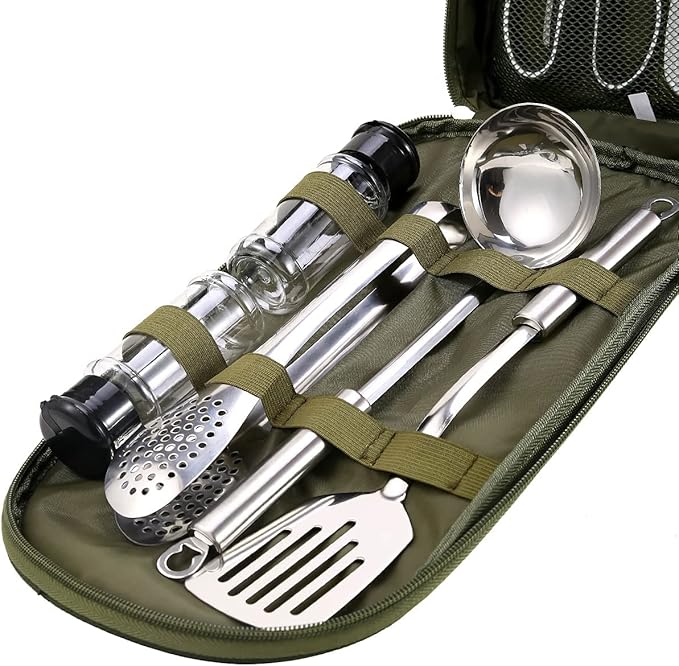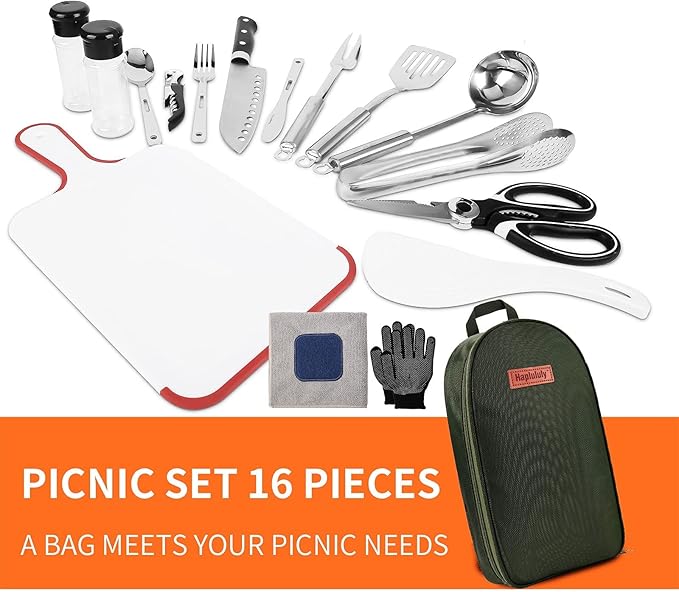 • 【widely used】 16 tools camping and cooking tools kit, cost-effective, designed for each family or outdoor enthusiast. This is a complete camping and kitchen tools kit to meet all your needs, for camping, parks, traveling, motorhome, backyard BBQ and party