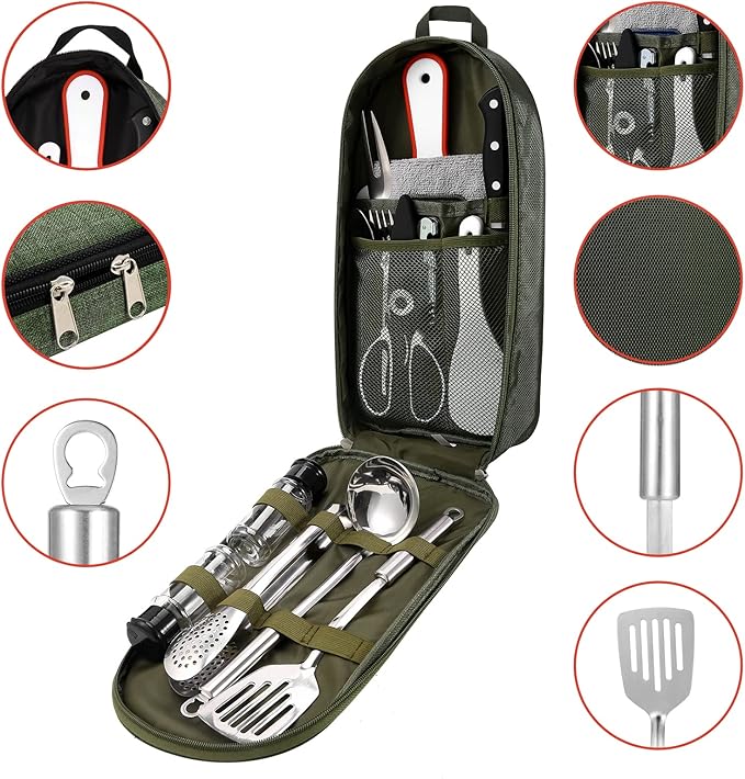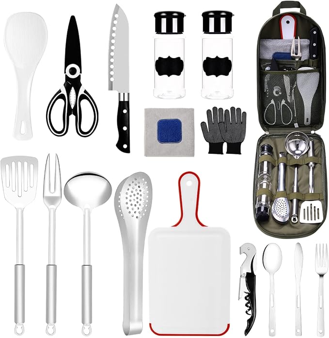 • 【What you will get】 Everyone has their unique use for the tools, and this kit will become your good partner for cooking. Including 1* Storage Bag, 1* Chopping Board, 1* Barbecue Fork, 1* Bottle Opener, 1* Non-Slip Gloves, 1* Cleaning Towel, 1* Frying Spatula, 1* Bread Clip, 1* Chef Knife, Tableware Knife/Fork /Spoon (3 Pieces) All Purchases Are Guaranteed. If You Have Any Questions About Our Products, Please Feel Free To Contact Us, We Will Try Our Best To Satisfy You.